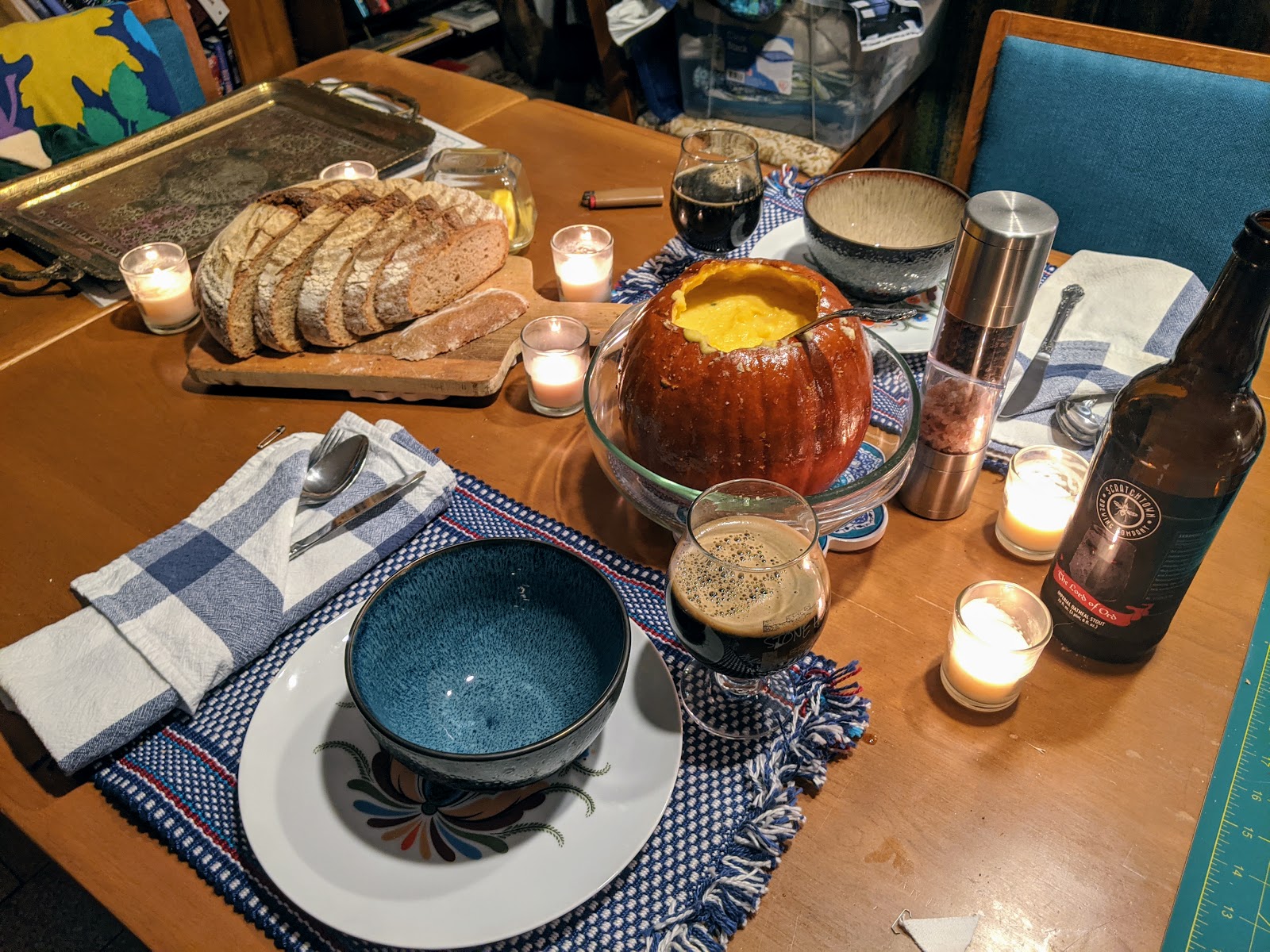 For dinner, Erik made a meal to my request: pumpkin soup and crusty bread. I’d been daydreaming about it, and idly spoke the whim aloud, and he took it upon himself to make it happen. We ate by candlelight (in the photo the overhead light is on, but we turned it off before sitting down.)