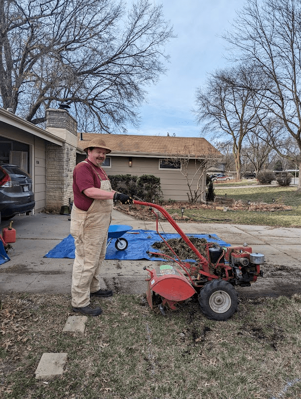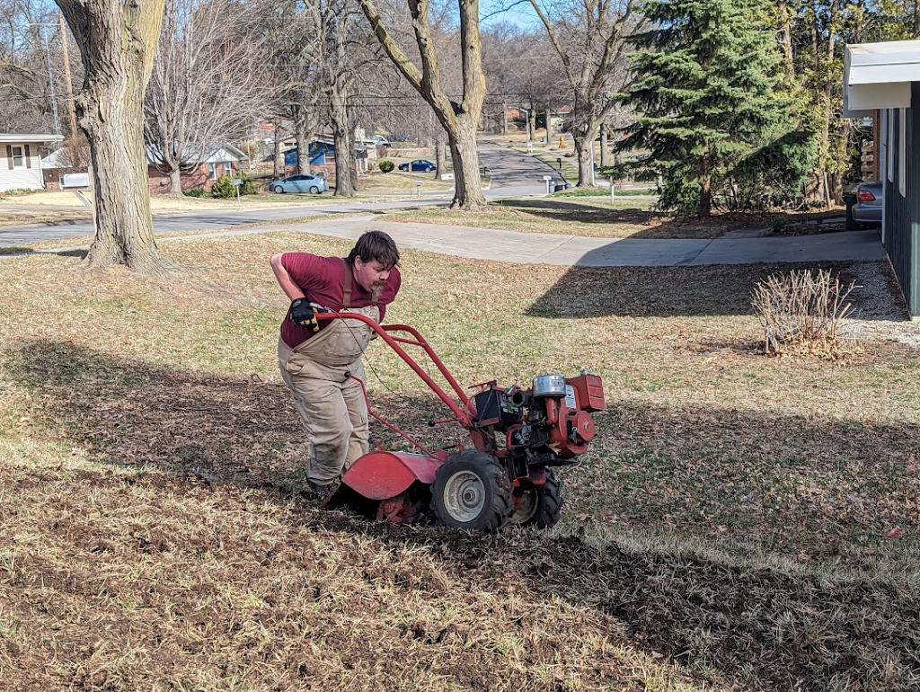 First, shouts to our neighbor across the street, Al, who loaned us truly huge tiller. Erik used this to till the ground (April 2, 2023).
