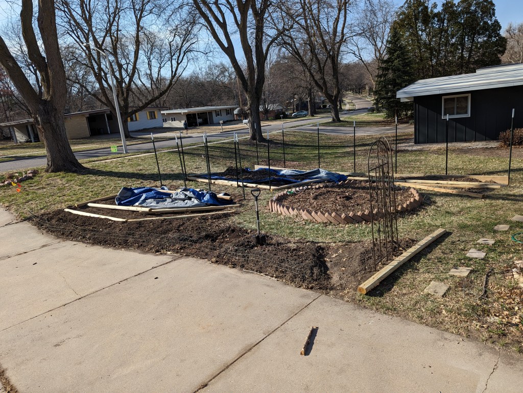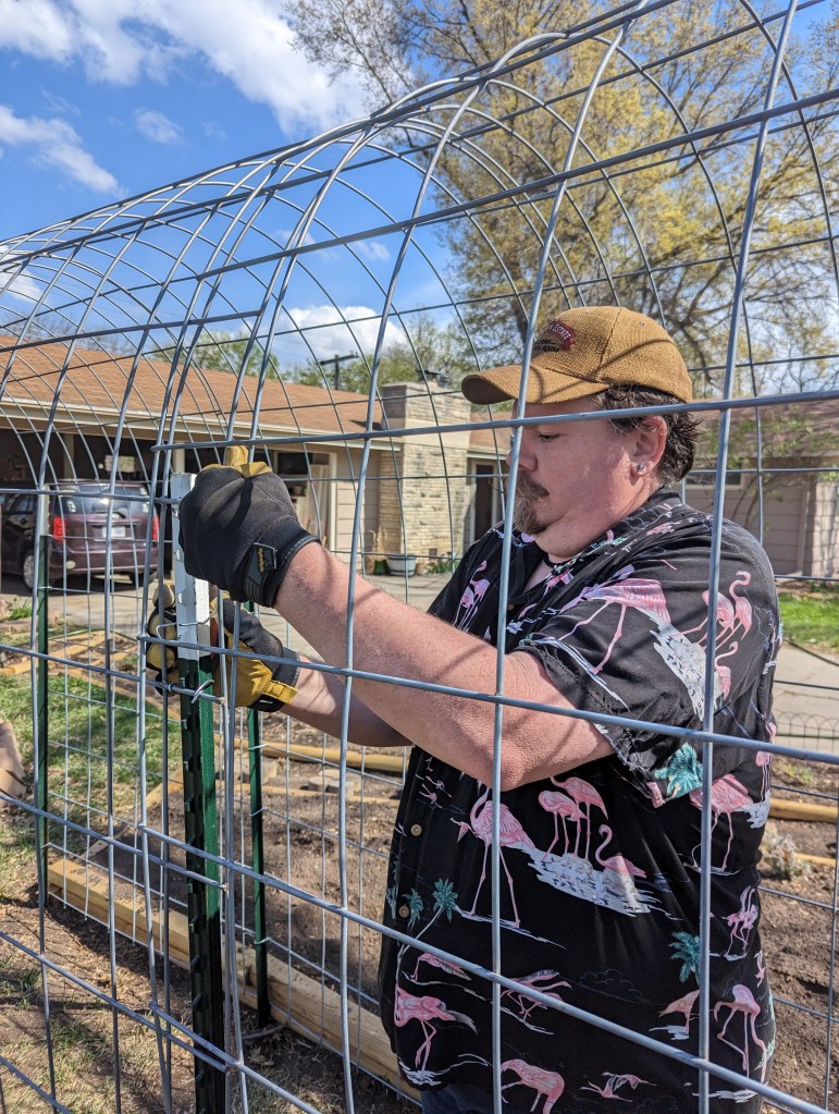And, a few days later, we installed. Erik cut timbers to length. We drilled holes through, and hammered long spikes into the ground to hold the timbers in place. Erik also placed the tposts, which was a major arm workout — lifting the heavy tpost pounder over his head, repeatedly. Once again, I was giddy as it started to “really look like a garden”.
