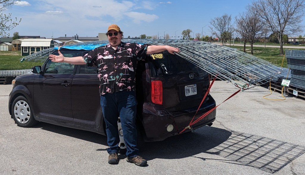 And that brings us to today! Saturday! Cattle panel day! The final infrastructure piece going in! Erik had a plan to bring them home using his scion. I was deeply skeptical. It’s a good little car, but it’s a little car, and these cattle panels are 16 feet long. I didn’t think a truck would necessarily be a simple solution either, and broadly speaking I trust Erik’s judgement, so I thought I’d let him try.