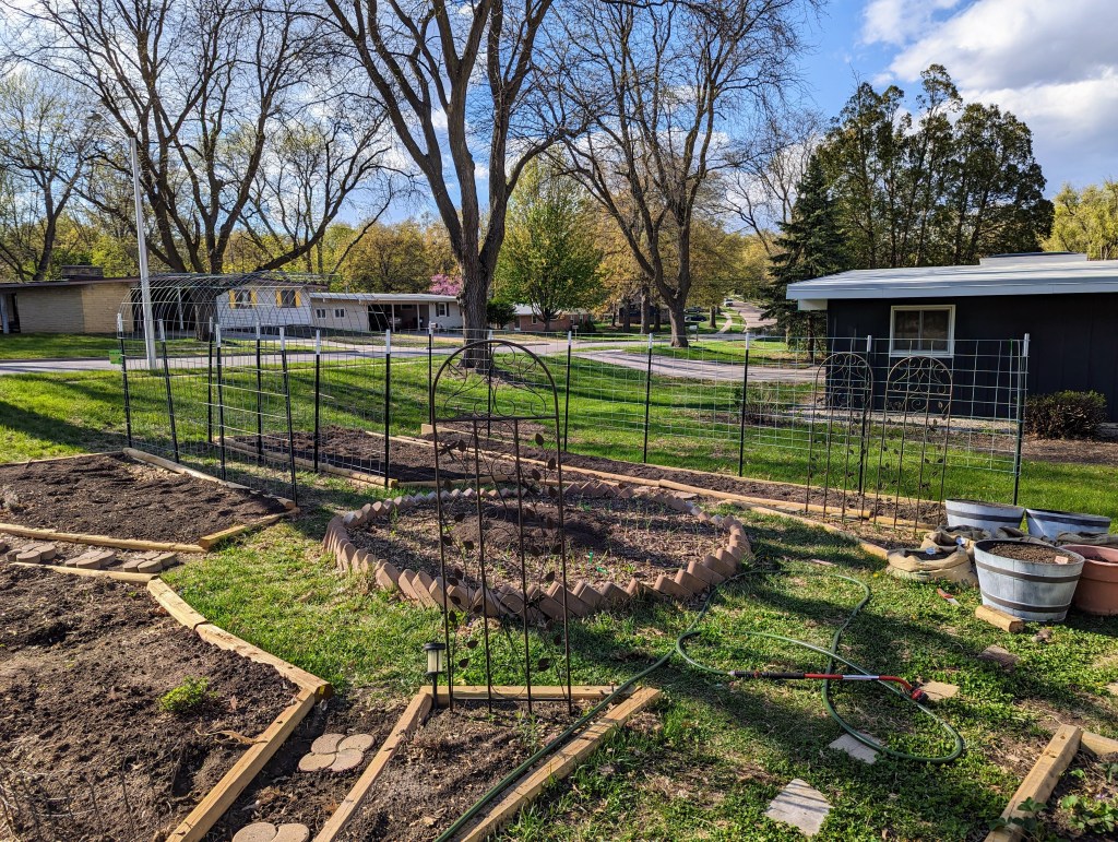 And now… it’s done! A stage set, ready to be filled with green things! Some cool-weather plants are already in… potatoes, onions, shallots, peas, radishes, lettuce, carrots, leeks… but soon it will be time to start really kicking into gear: tomatoes, peppers, herbs, beans, cucumbers, squash… we will have such an abundance!