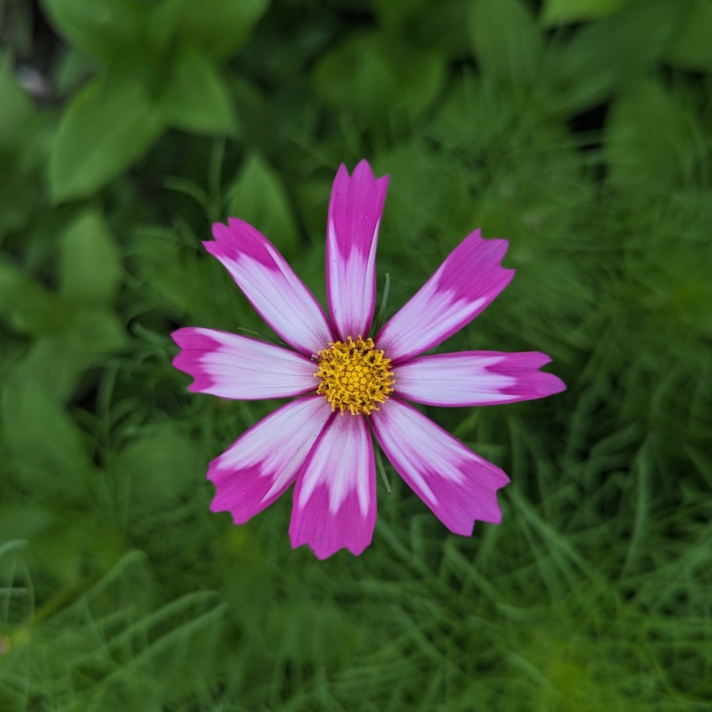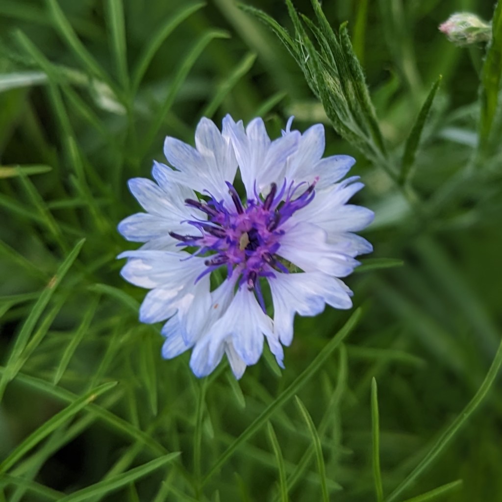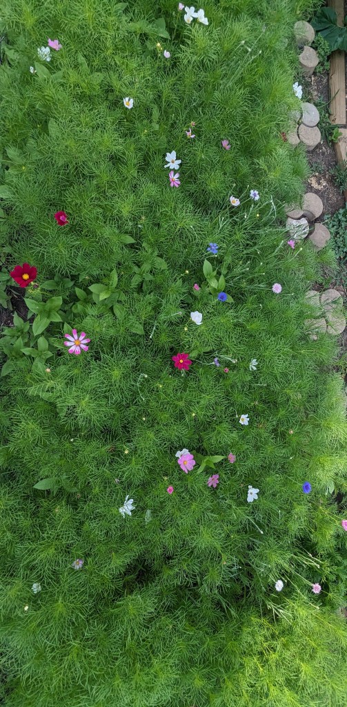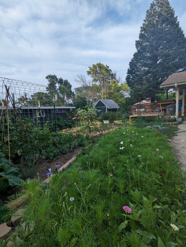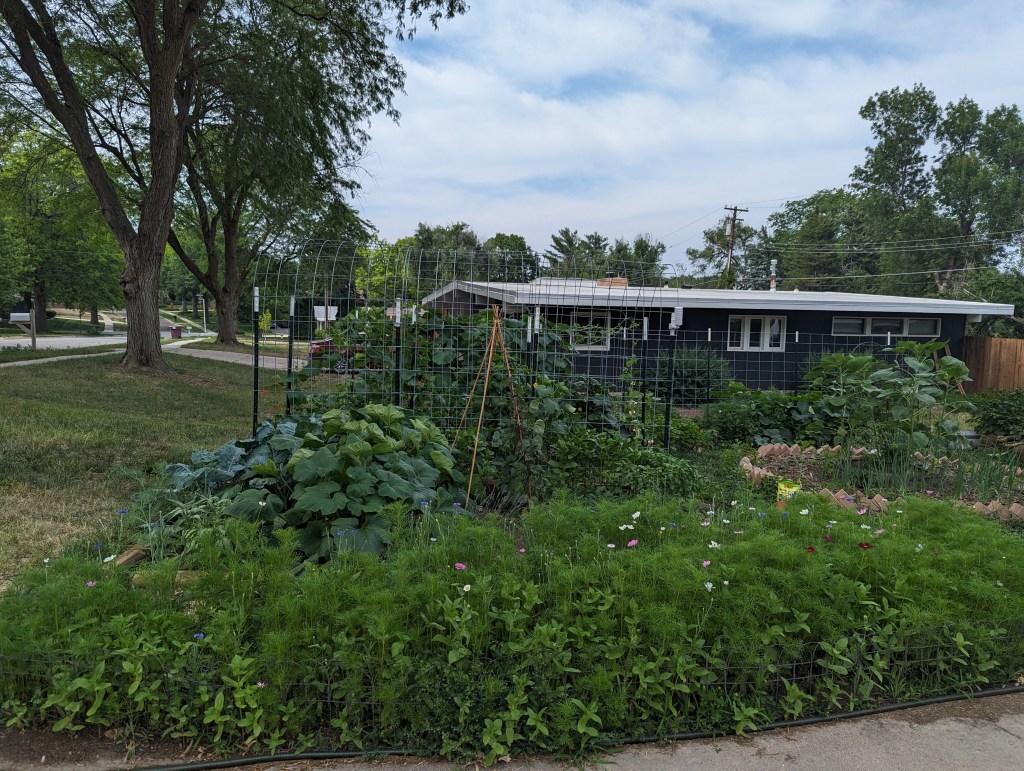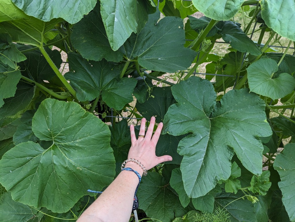The garden is lush and verdant. The squash and gourds are putting on HUGE leaves. The bank of cosmos, zinnias, and bachelor’s buttons has begun to pop. Every tomato plant has green fruits ripening on the vine. We have a couple of peppers forming, and some eggplants.