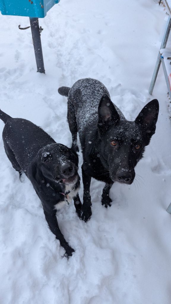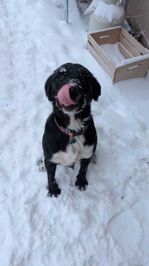 It was Lizzie’s first big snow. She loved it, tearing exuberantly up and down the yard. Luca, too, loves snow, and was delighted to have a playmate. Throughout the day, they would cycle from playing in the snow, then come in for a thorough toweling off (known as “dog rubbies”) and a nap. Repeat.