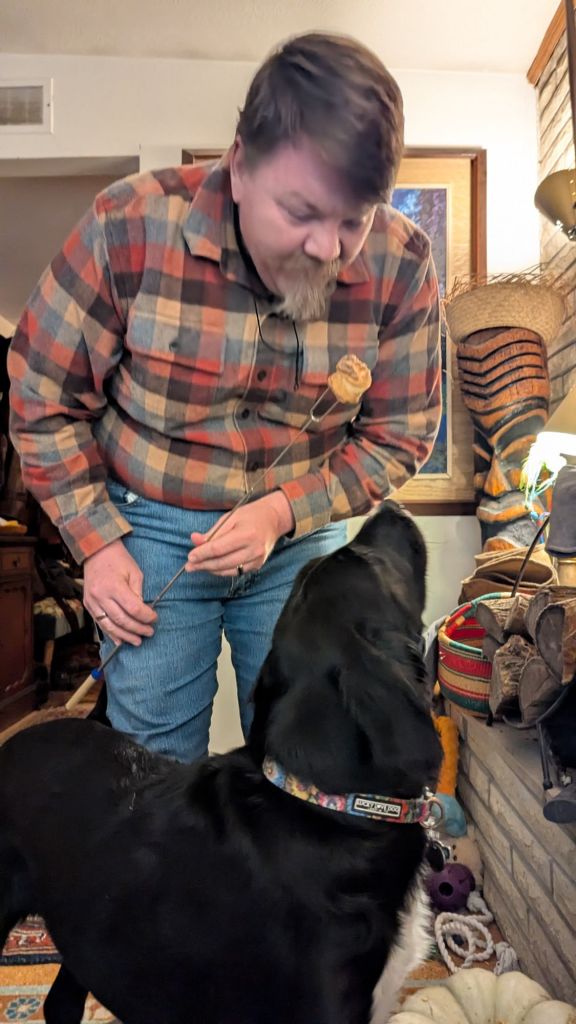 To end the evening, I roasted marshmallows in the fire and made s’mores. Erik made himself a perfectly toasted marshmallow. (Lizzie was interested.)